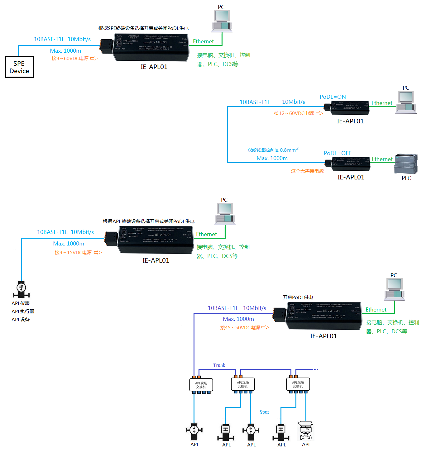 最大傳輸距離 | 1000米。如果使用PoDL供電,則距離受功率和電纜截面積限制。 |